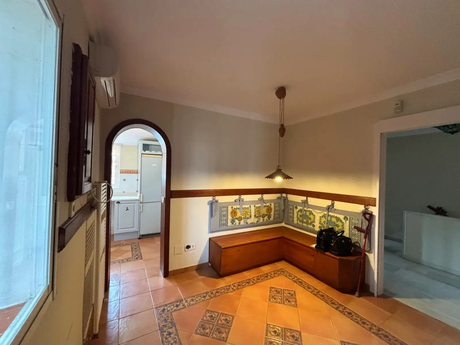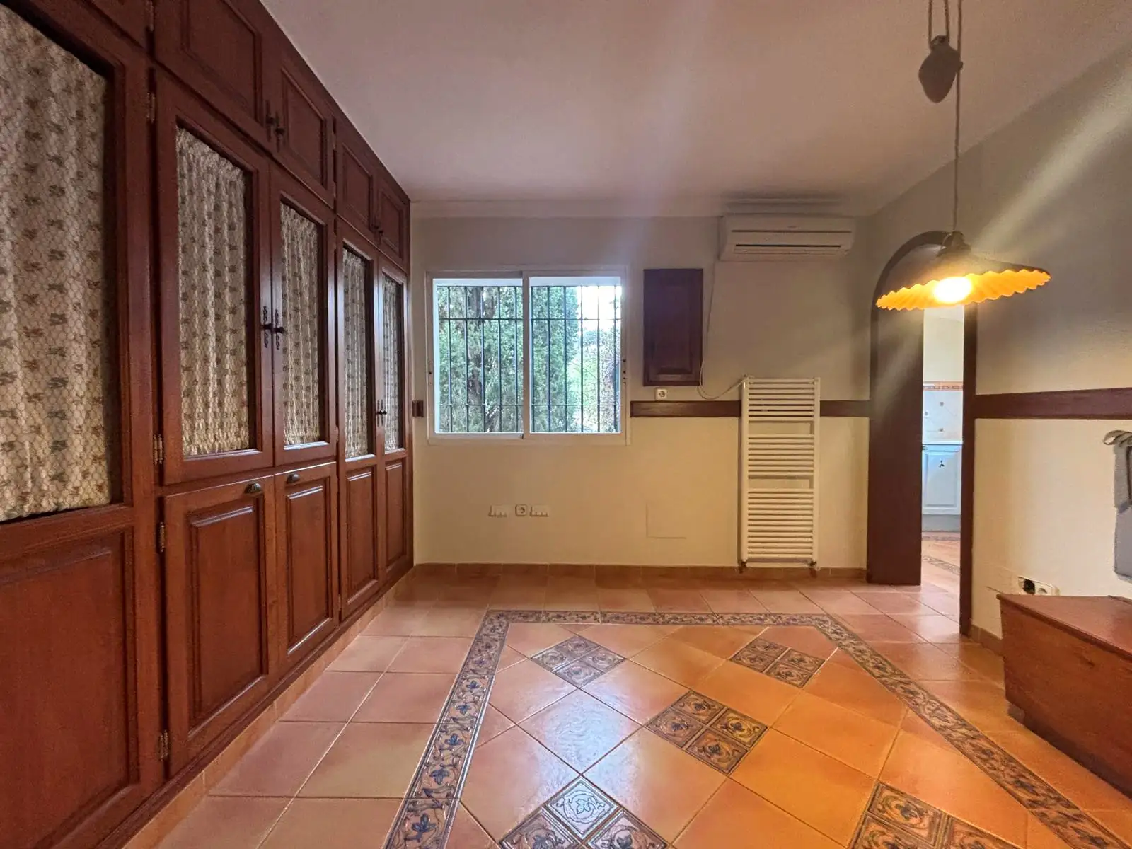 Desde el primer tramo de la casa se percibe una distribución orientada a la vida diaria: un salón amplio con chimenea y librerías empotradas, suelos de mármol que dan continuidad a la zona de día y una conexión directa con la terraza cubierta. Esa salida exterior amplía la sensación de espacio útil y ayuda a entender por qué esta vivienda en venta en Brisas II puede encajar tanto en quien busca una casa con jardín privado en La Duquesa como en quien valora una casa de 3 dormitorios en Manilva dentro de una urbanización consolidada.